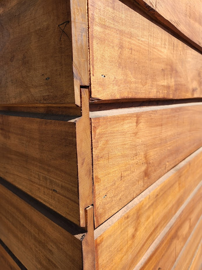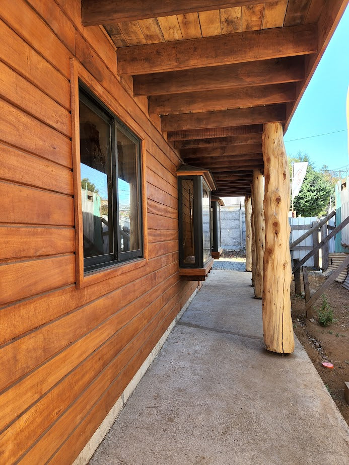 Además en la entrada para los pilares, instalamos madera de Ciprés usando el tronco completo descortezado