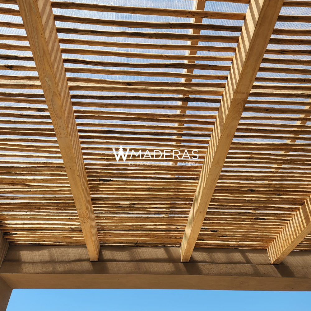 Las vigas laminadas de pino clear ofrecen una estructura sólida y estética, mientras que el quiebravista de varas de eucaliptus añade un toque contemporáneo y funcional al diseño.