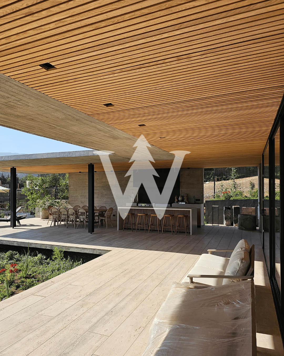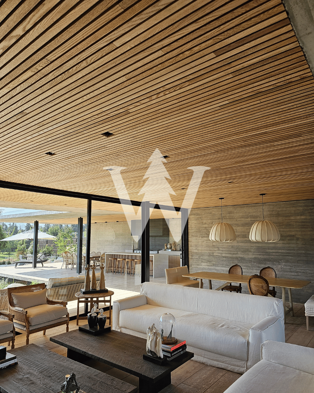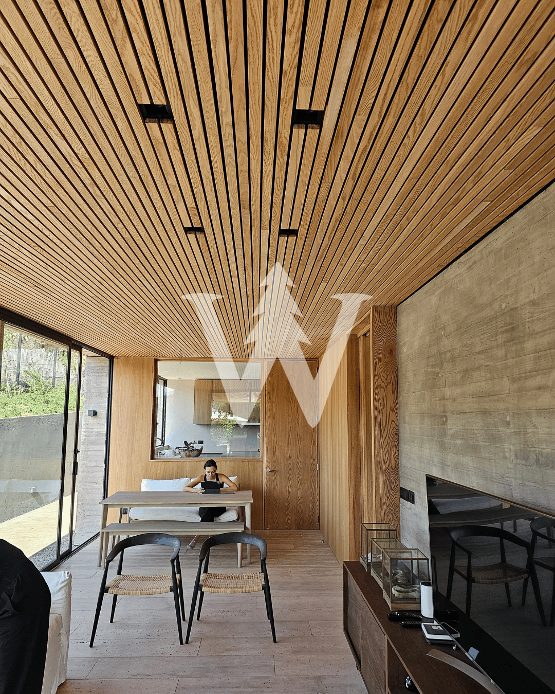 En la Casa Valle Escondido se diseñó un ambiente moderno y elegante utilizando madera de Roble Americano en formato de listones para el cielo y el quiebravista. Este material aporta luminosidad, calidez y sofisticación, transformando los espacios en un entorno acogedor y de gran nivel arquitectónico.