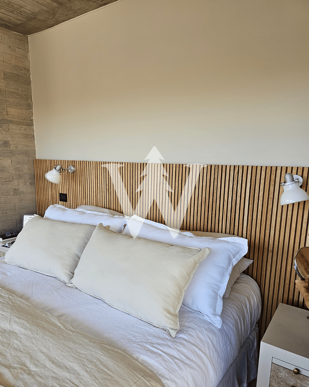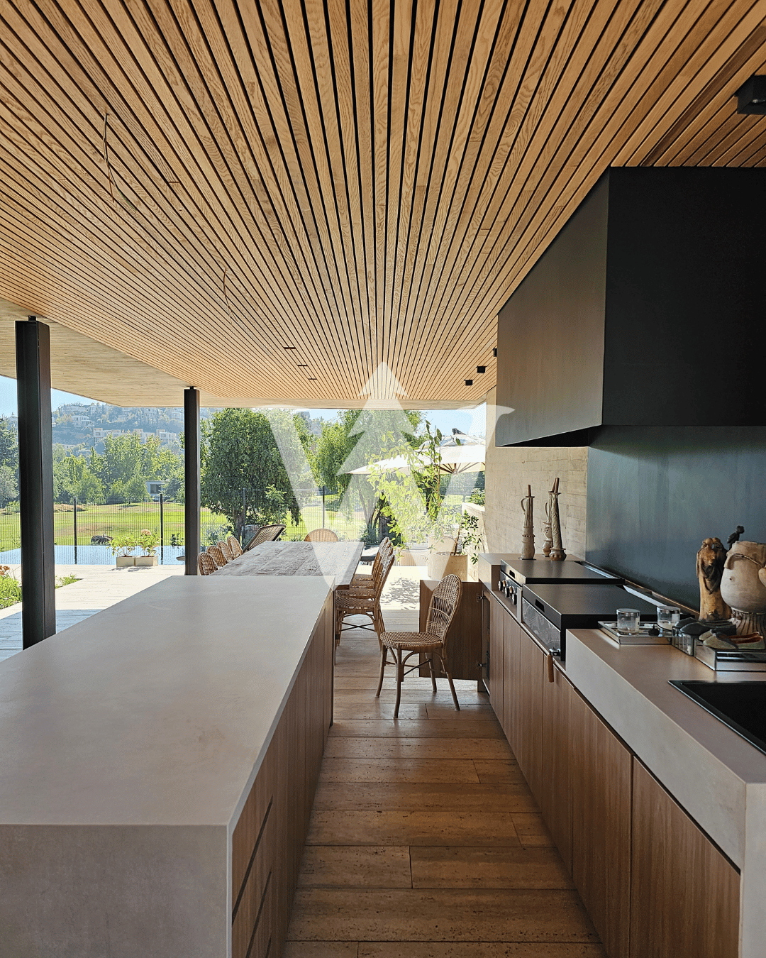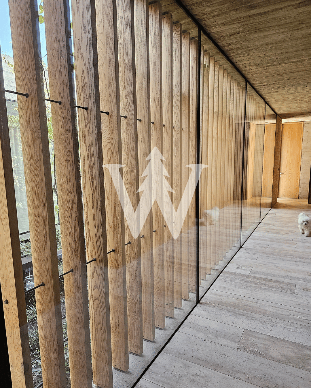 En la Casa Valle Escondido se diseñó un ambiente moderno y elegante utilizando madera de Roble Americano en formato de listones para el cielo y el quiebravista. Este material aporta luminosidad, calidez y sofisticación, transformando los espacios en un entorno acogedor y de gran nivel arquitectónico.