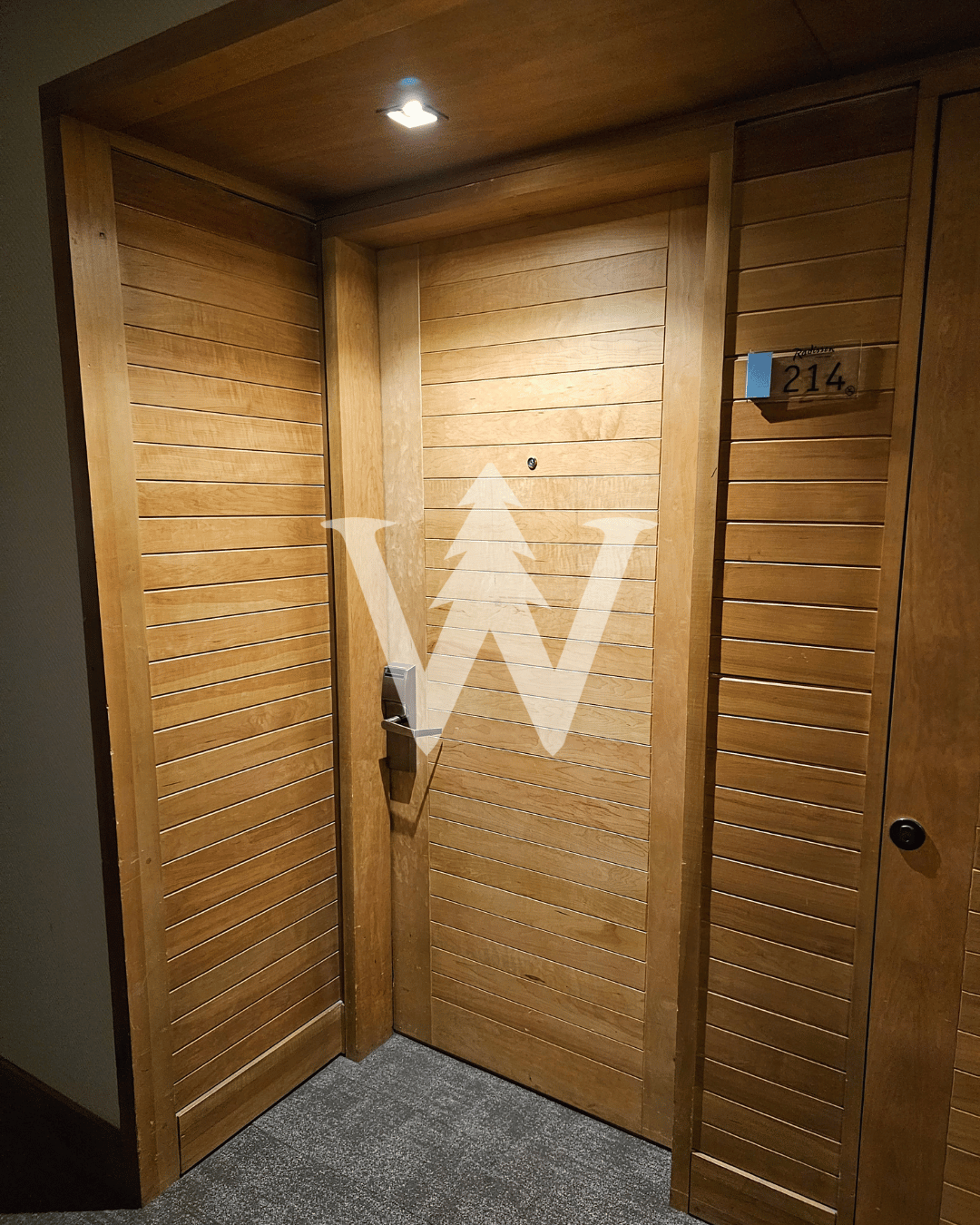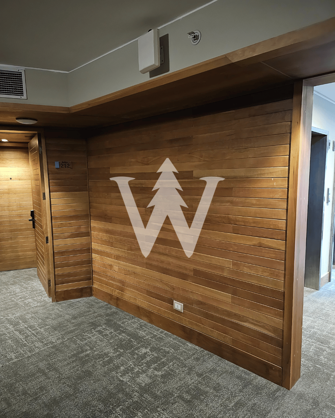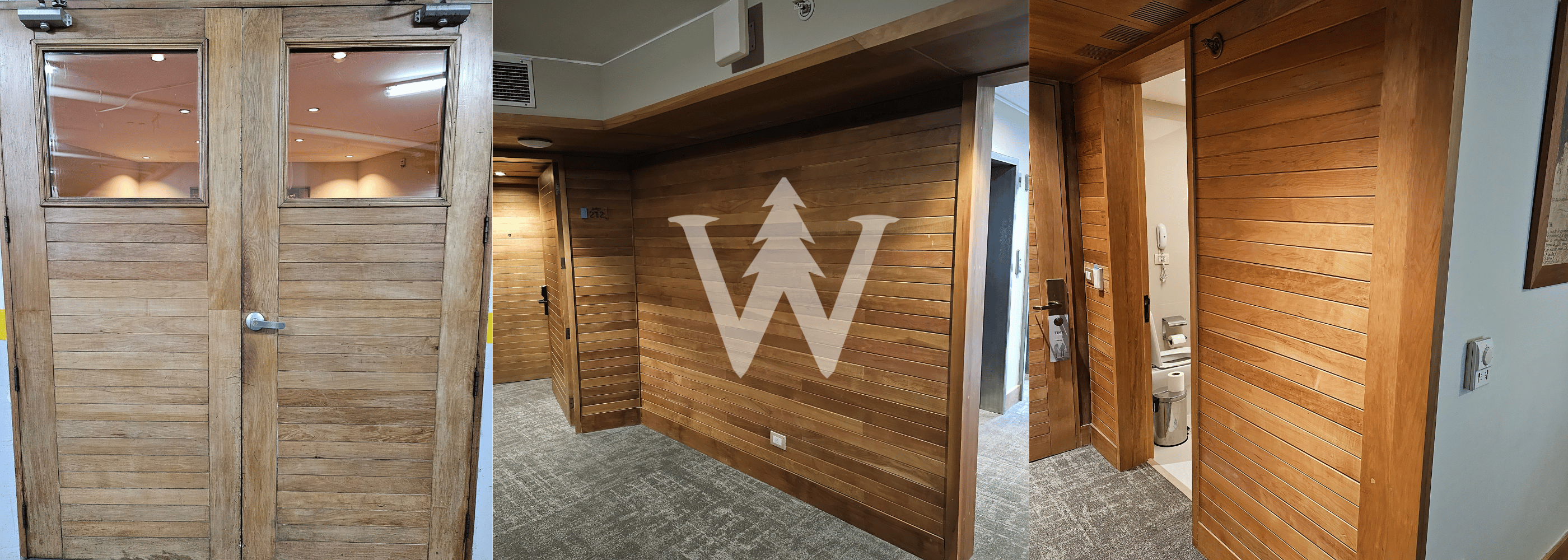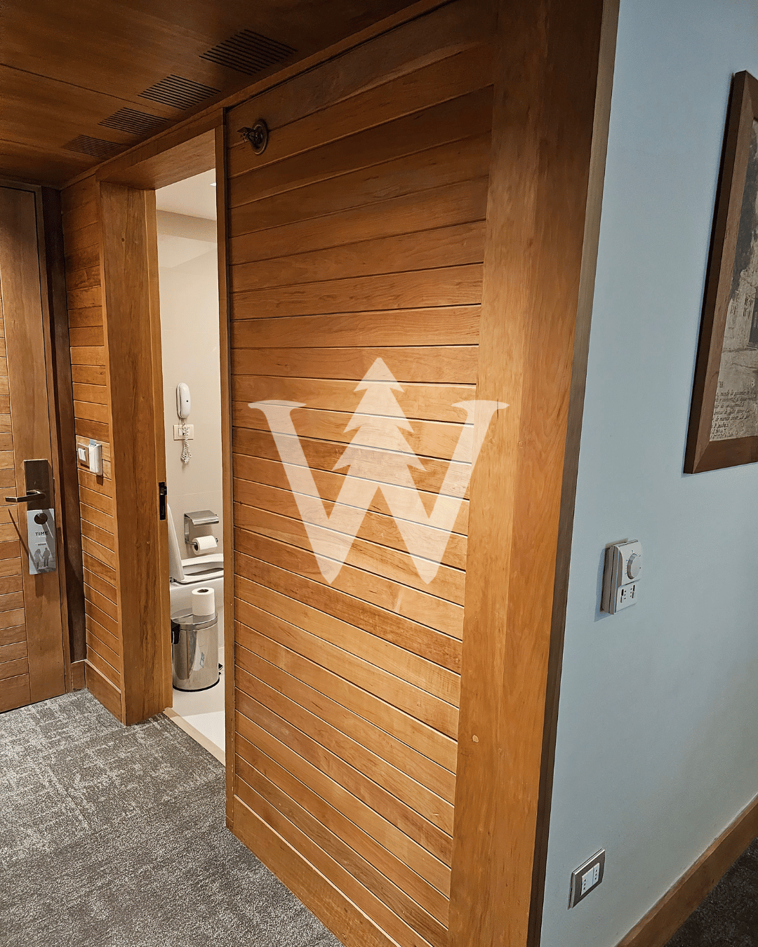La madera fue aplicada en múltiples elementos arquitectónicos y de carpintería interior, logrando una estética natural y de alto estándar hotelero.