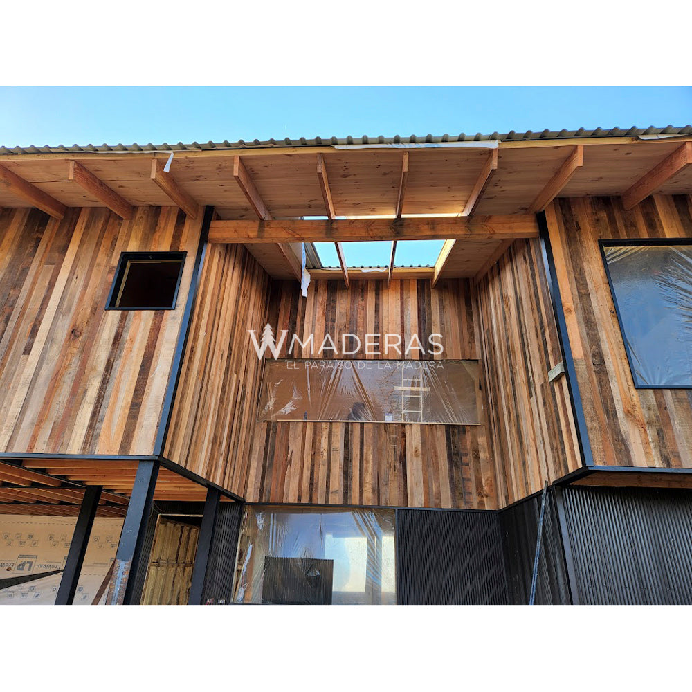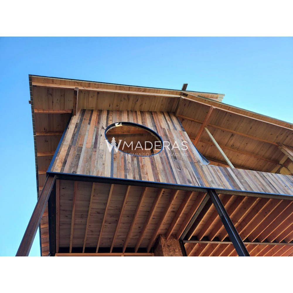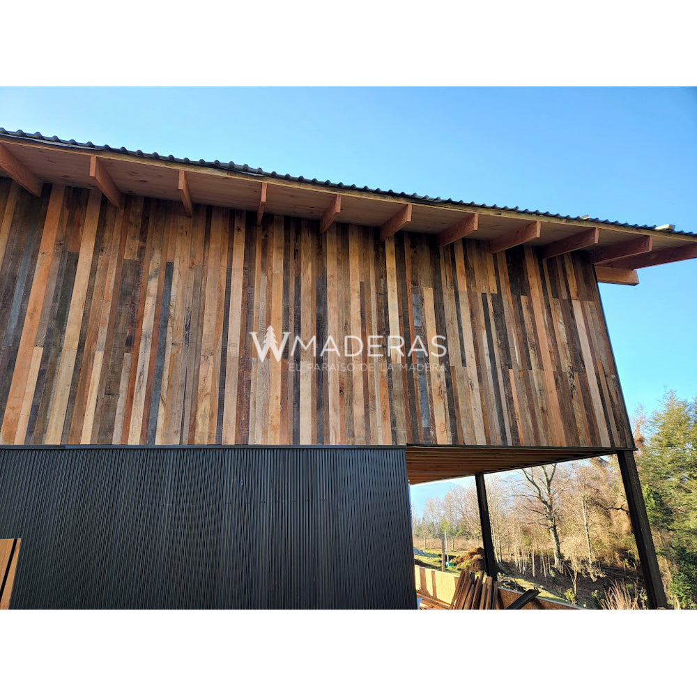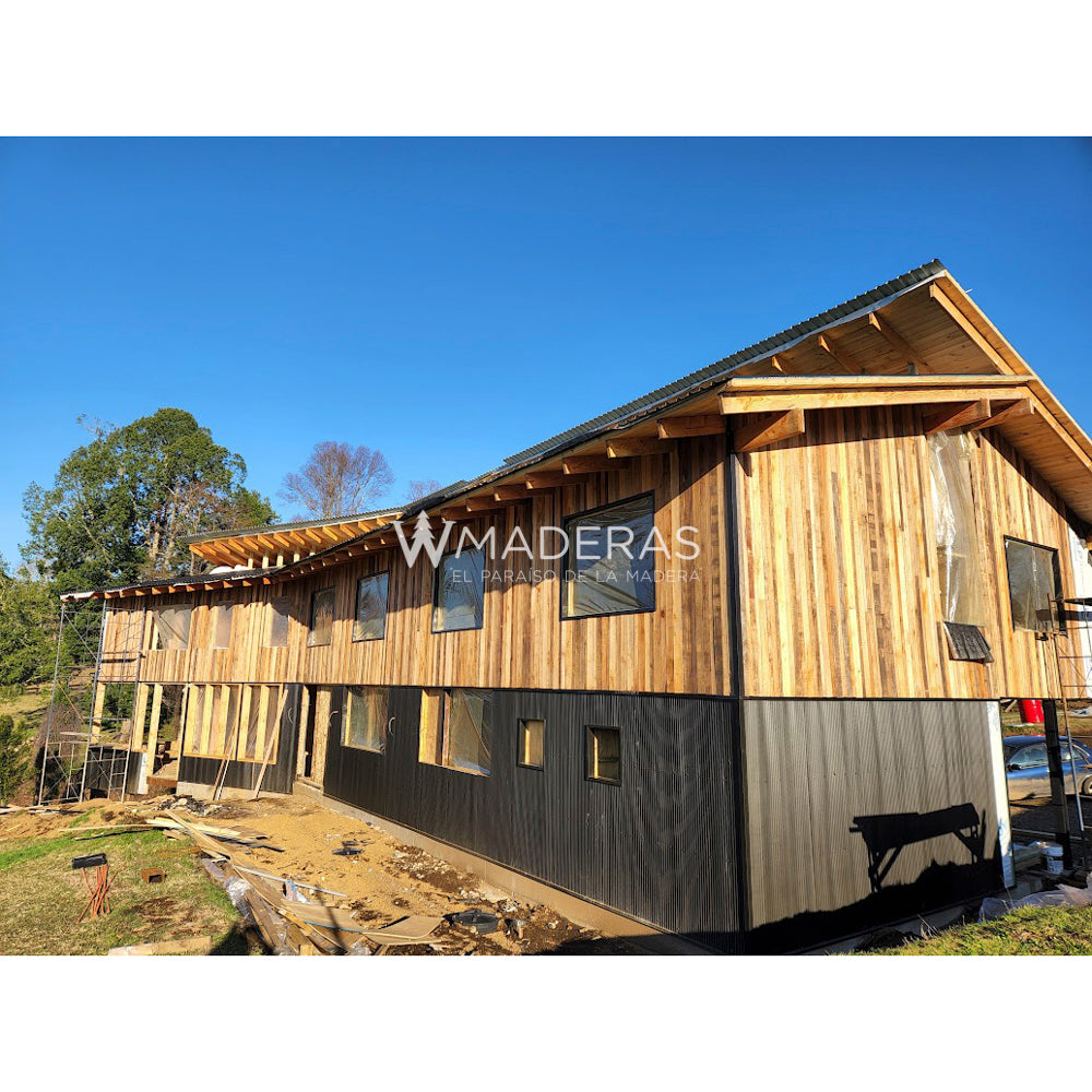 En el exterior utilizamos tablas de madera nativa como: Roble, Raulí, Coihue. Las tablas fueron fabricadas con machihembrado canto recto de 2mm en su cara lateral para poder unirlas de forma correcta.