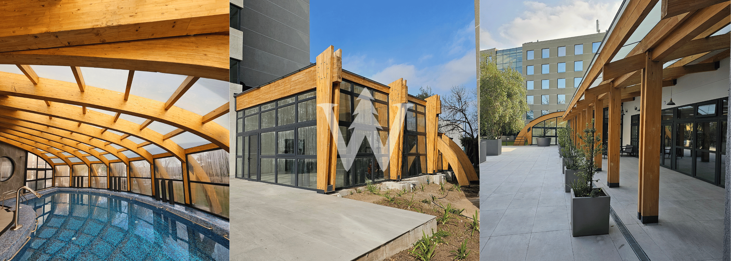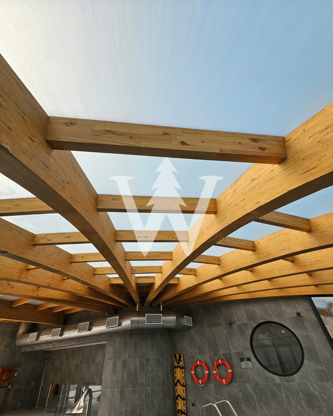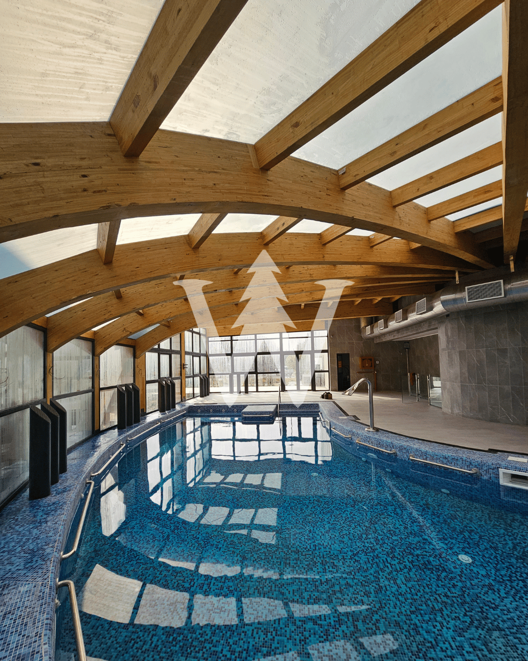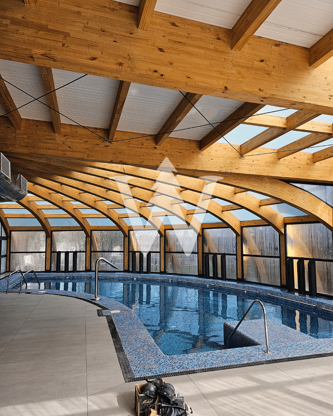 En este proyecto se instalaron vigas laminadas de madera impregnadas en tono incoloro semiclear, diseñadas especialmente para resistir las condiciones de calor, humedad y condensación propias de una piscina temperada.