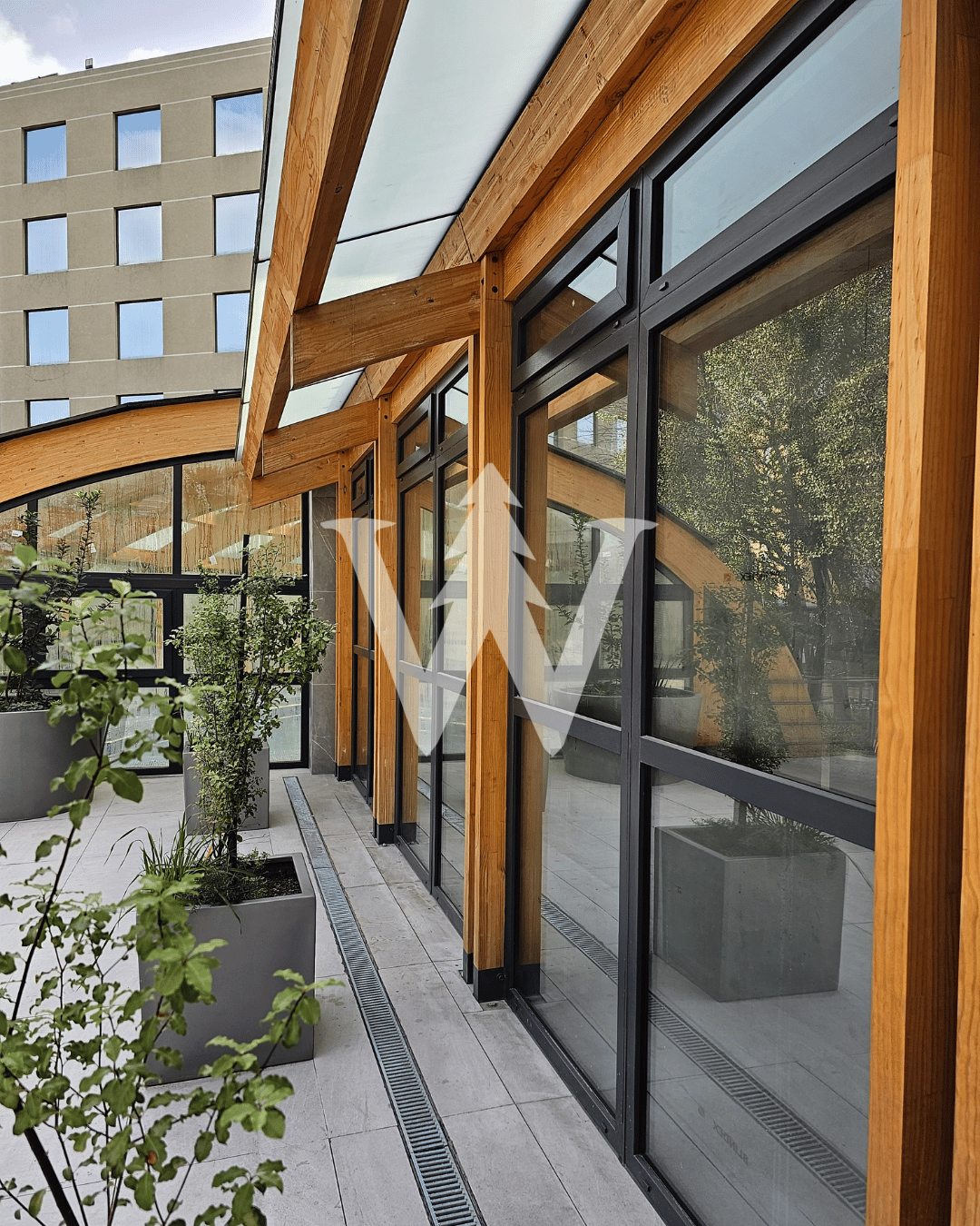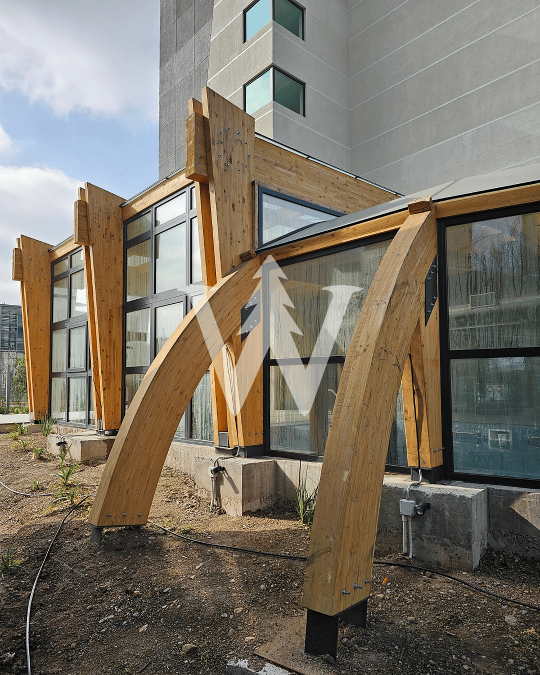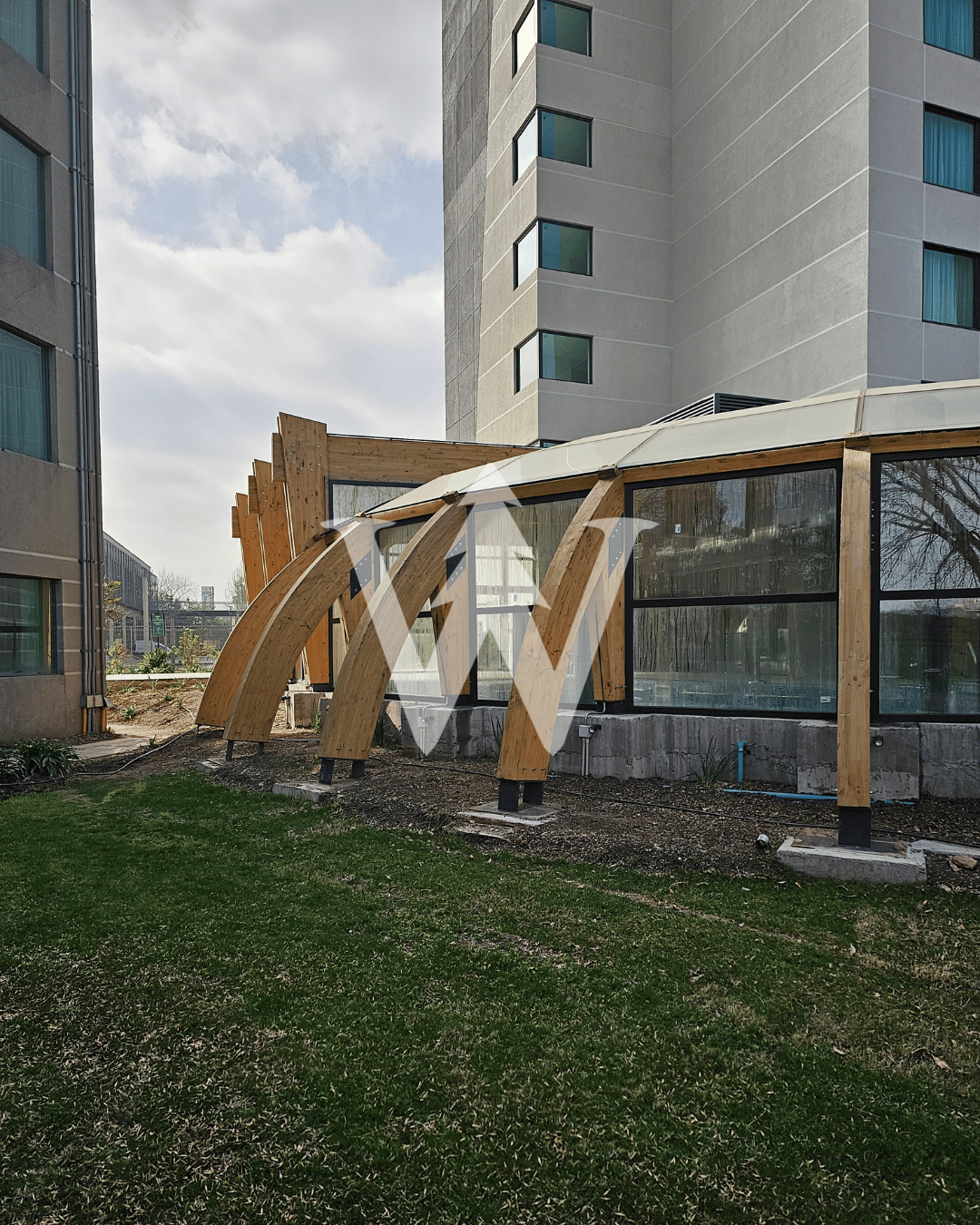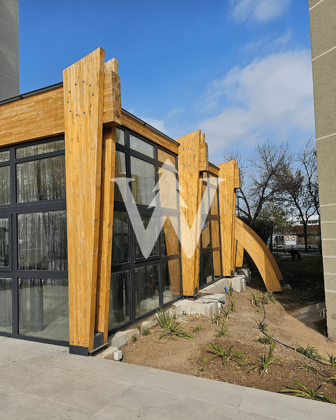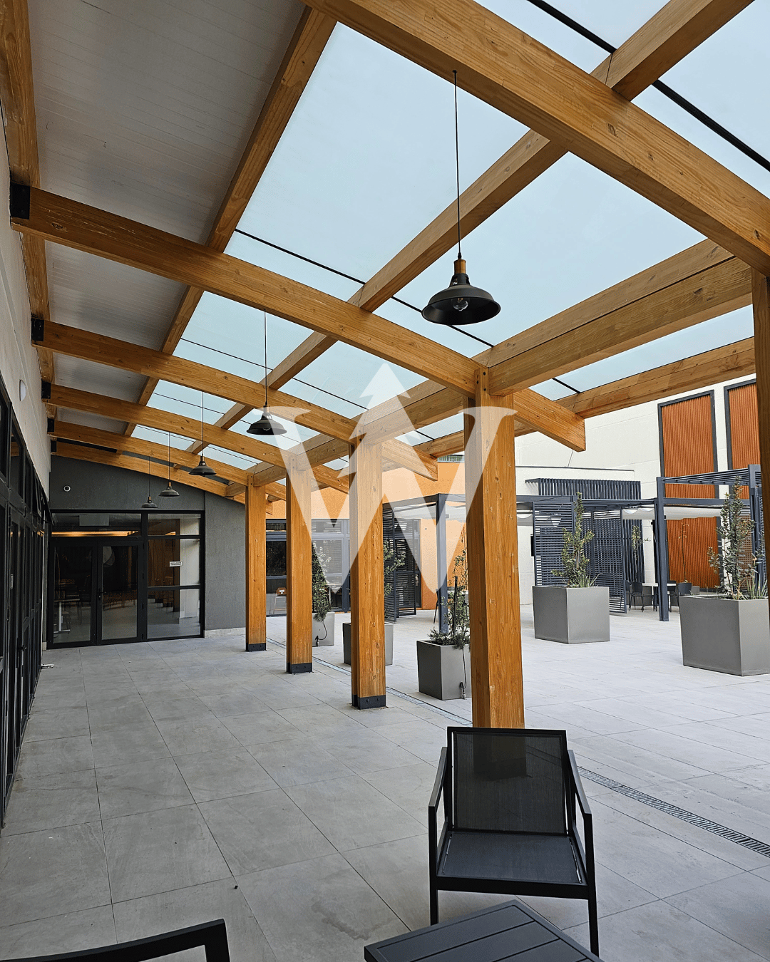 En este proyecto se instalaron vigas laminadas de madera impregnadas en tono incoloro semiclear, diseñadas especialmente para resistir las condiciones de calor, humedad y condensación propias de una piscina temperada.