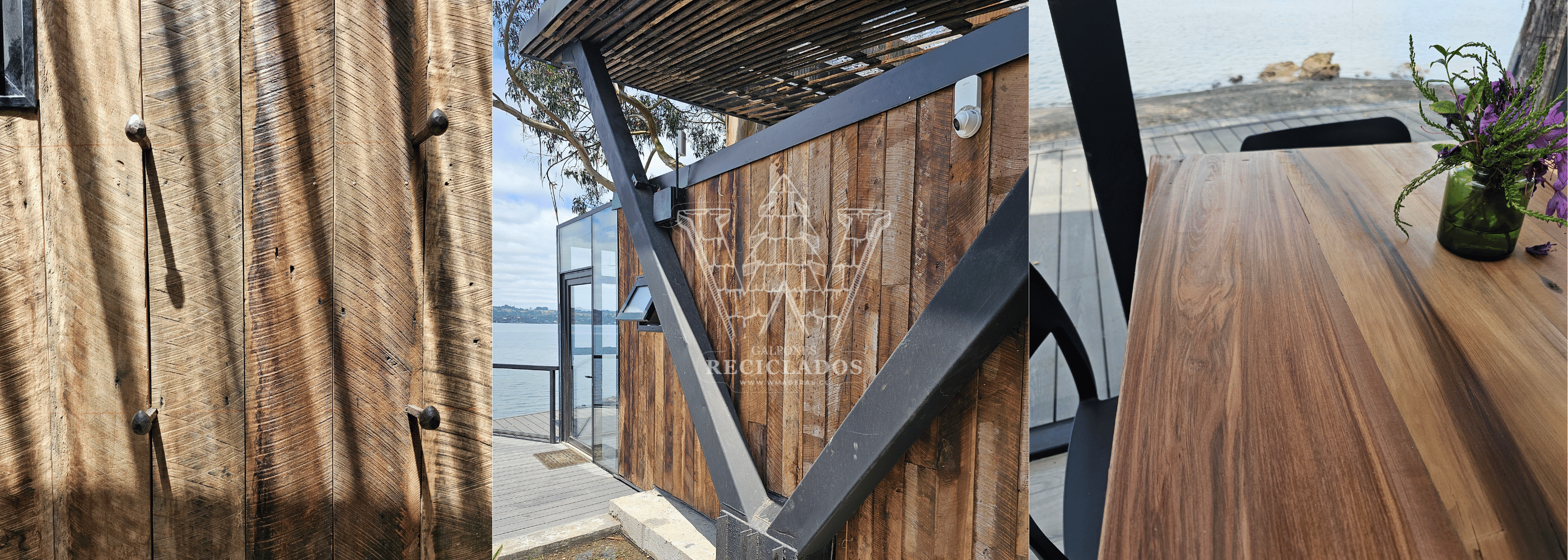 En este Hotel de Puerto Varas se utilizó madera reciclada/demolición para los revestimientos interiores y exteriores, logrando un diseño cálido y con identidad local. Además, se fabricaron cubiertas a medida en madera reciclada para las mesas del restaurante y las cubiertas de la cocina, aportando un estilo auténtico, sustentable y exclusivo en cada detalle.