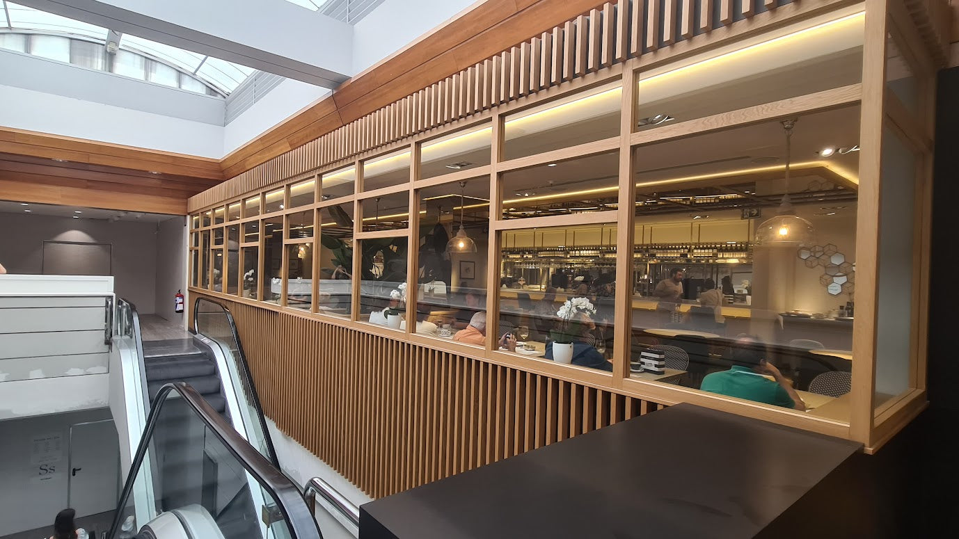 En este proyecto exterior utilizamos listones de madera nativa Lenga para darle un toque fino y exclusivo al restaurant